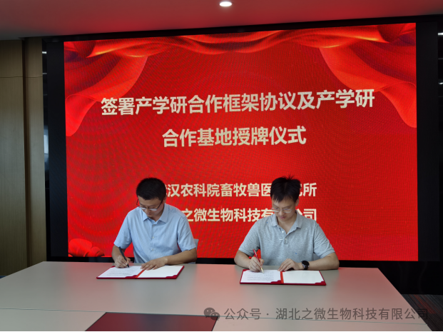 2024年7月5日,武汉市农科院畜牧兽医研究所与湖北之微生物科技有限公司在武汉江夏,成功签署产学研战略合作协议。以此为契机,双方将在新型减抗替抗生物制剂研发等领域开展密切合作,实现“产教融合、科教融合、合作共赢”,集智集力为养殖行业健康发展作出贡献。